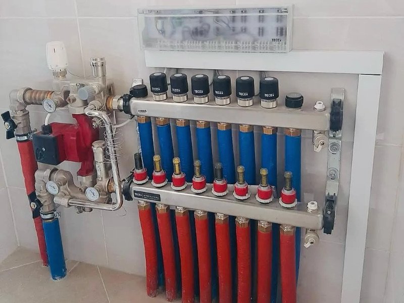 - Оснащение коллекторов: Монтаж сервоприводов на каждый контур отопления и их подключение к коммутационному блоку (центру коммутации).